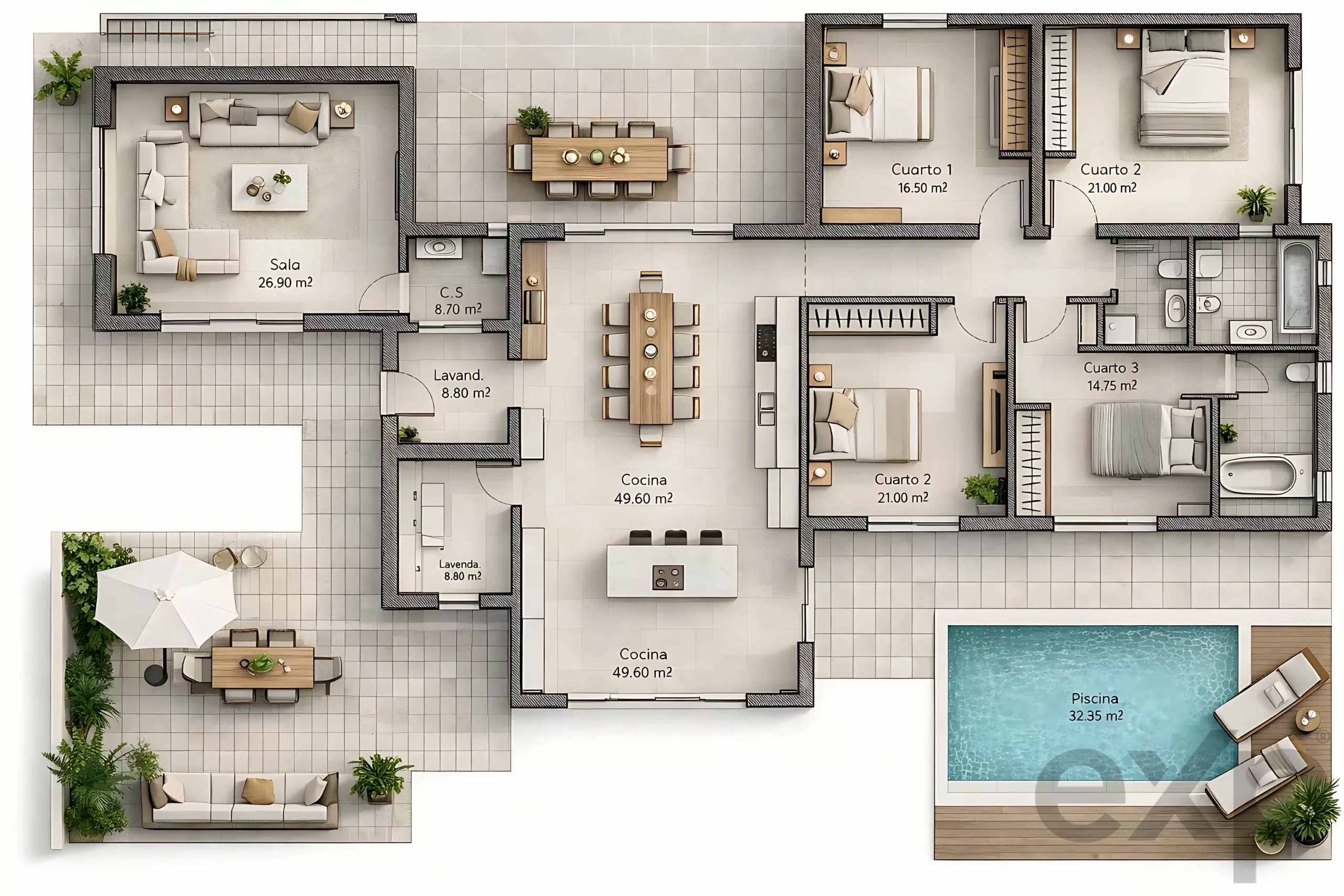In the private wing, the layout has been carefully balanced to ensure both comfort and functionality. Two spacious suites provide superior comfort and privacy. Two additional bedrooms offer flexibility for family living, a home office or guest accommodation. The villa also includes two supporting bathrooms and a fully equipped laundry room, reinforcing practicality.