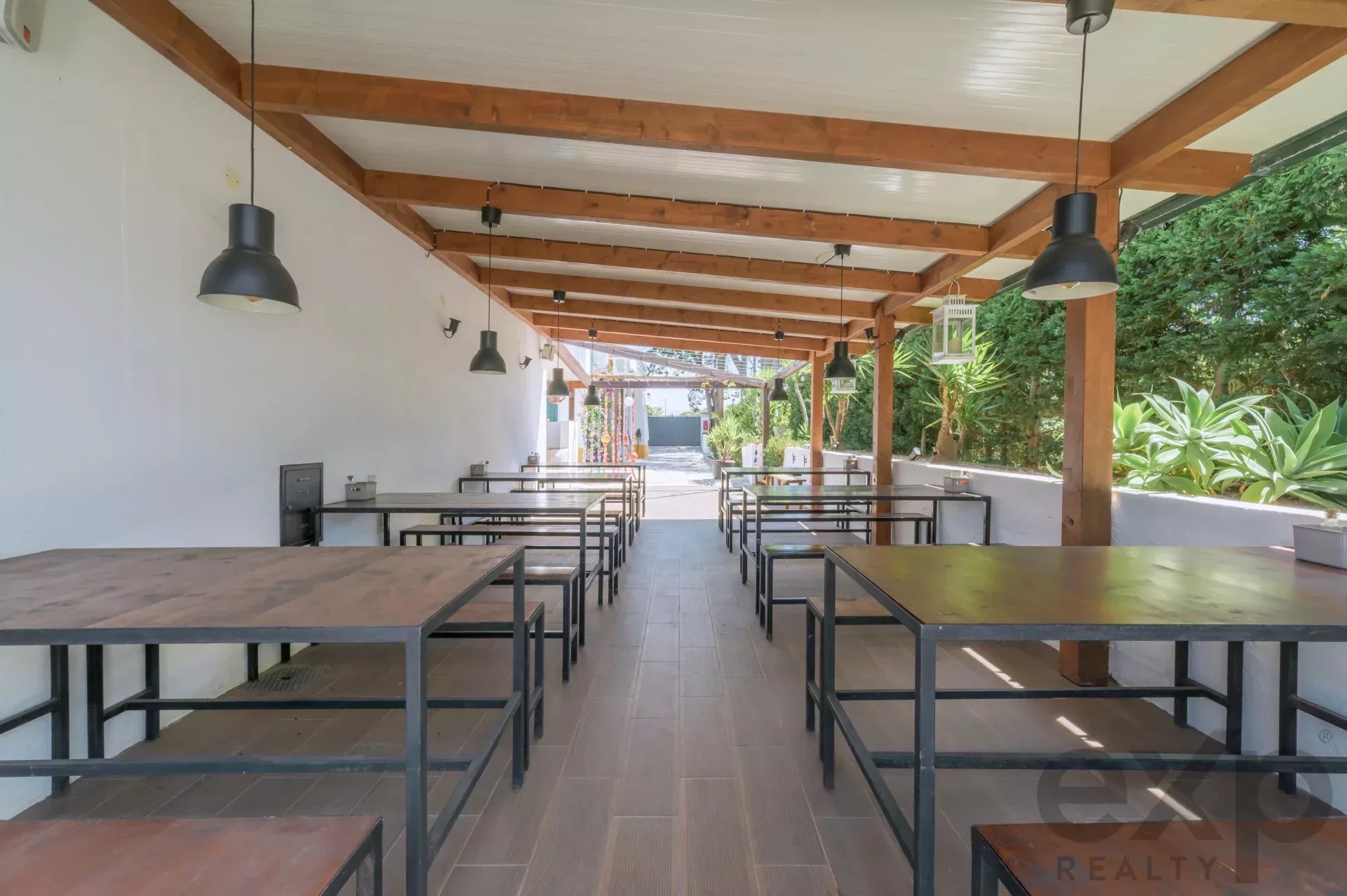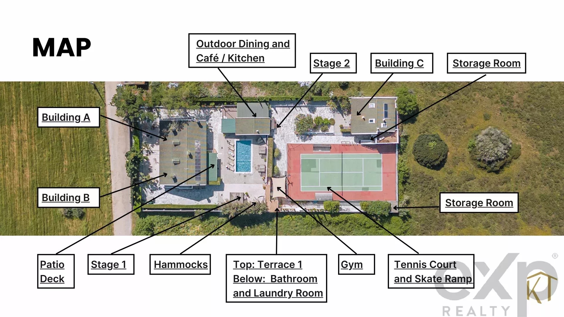 The rear entrance opens to a vibrant pool and social area, featuring a stage, a serene hammock zone, and a rooftop terrace. This area seamlessly connects to a supporting building that houses a communal kitchen and café, complete with a covered outdoor seating area. Continuing through the grounds, you’ll discover a large communal dining and lounge space shaded by fruit trees nearby, a second, more intimate stage, an outdoor gym, bathroom facilities, and a laundry room. Additional amenities include a tennis court and skate ramps, enhancing the property's appeal for both recreational and retreat-style uses.
