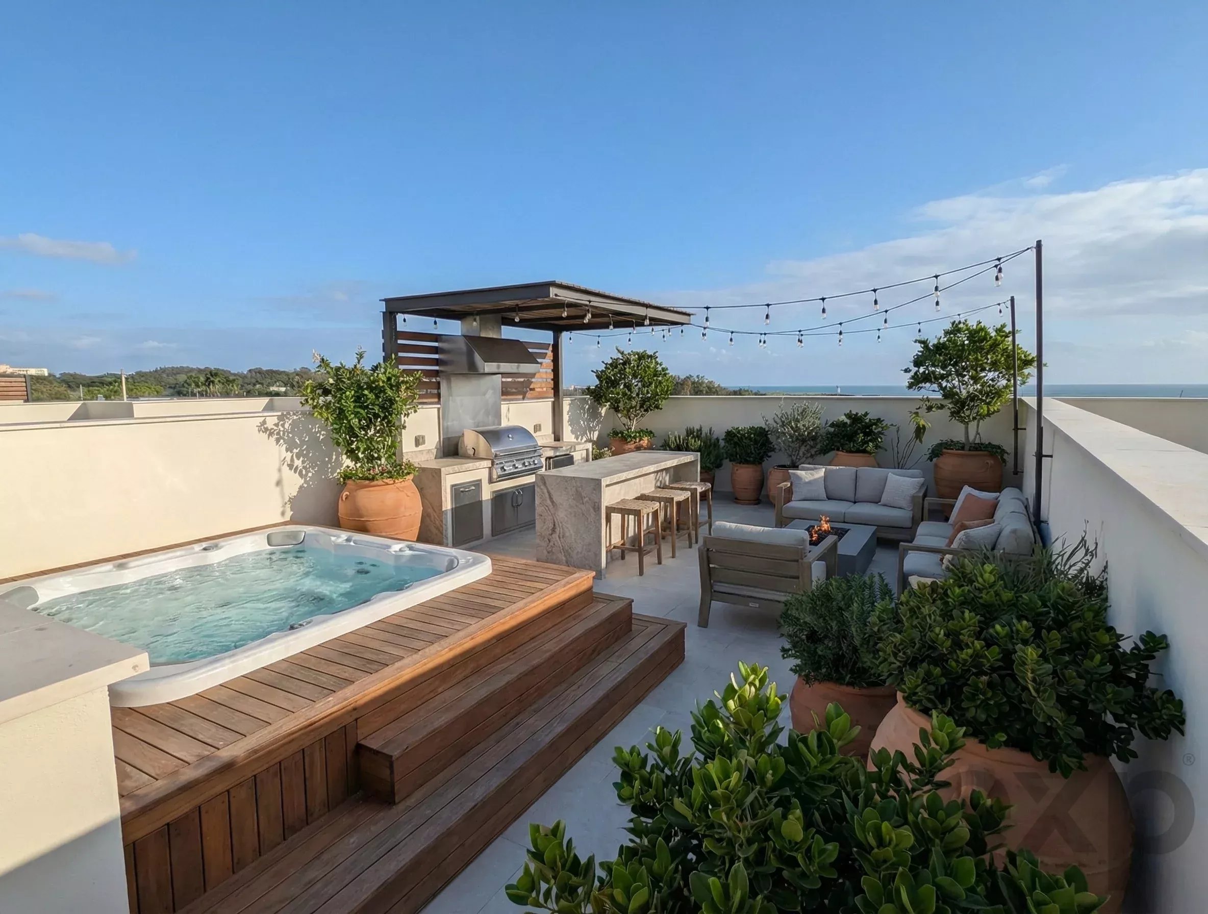 The heart of the home opens onto a 13m² balcony, but the real showstopper awaits above: a massive 54.7m² private rooftop terrace. Equipped with a BBQ area and pre-installation for a Jacuzzi, this is your private sanctuary for sunset cocktails or entertaining friends under the Algarve sky.