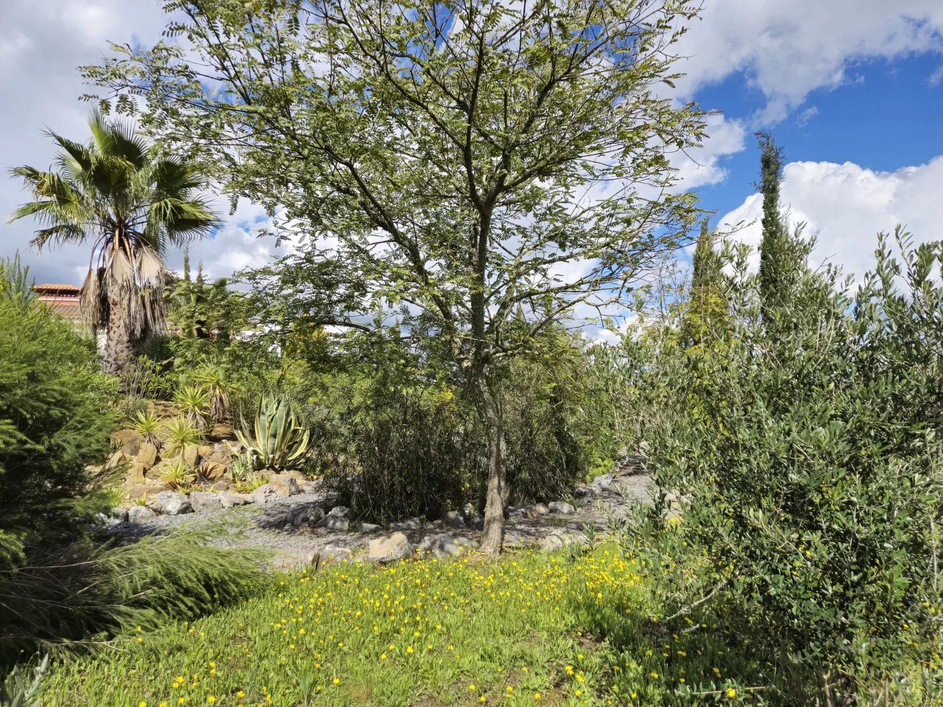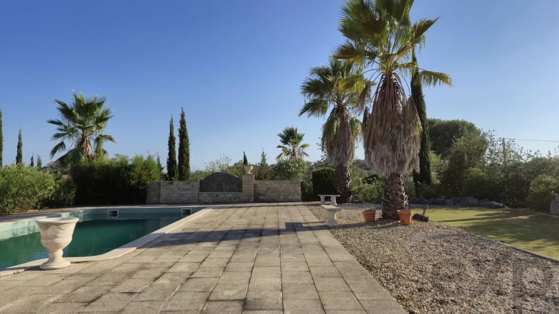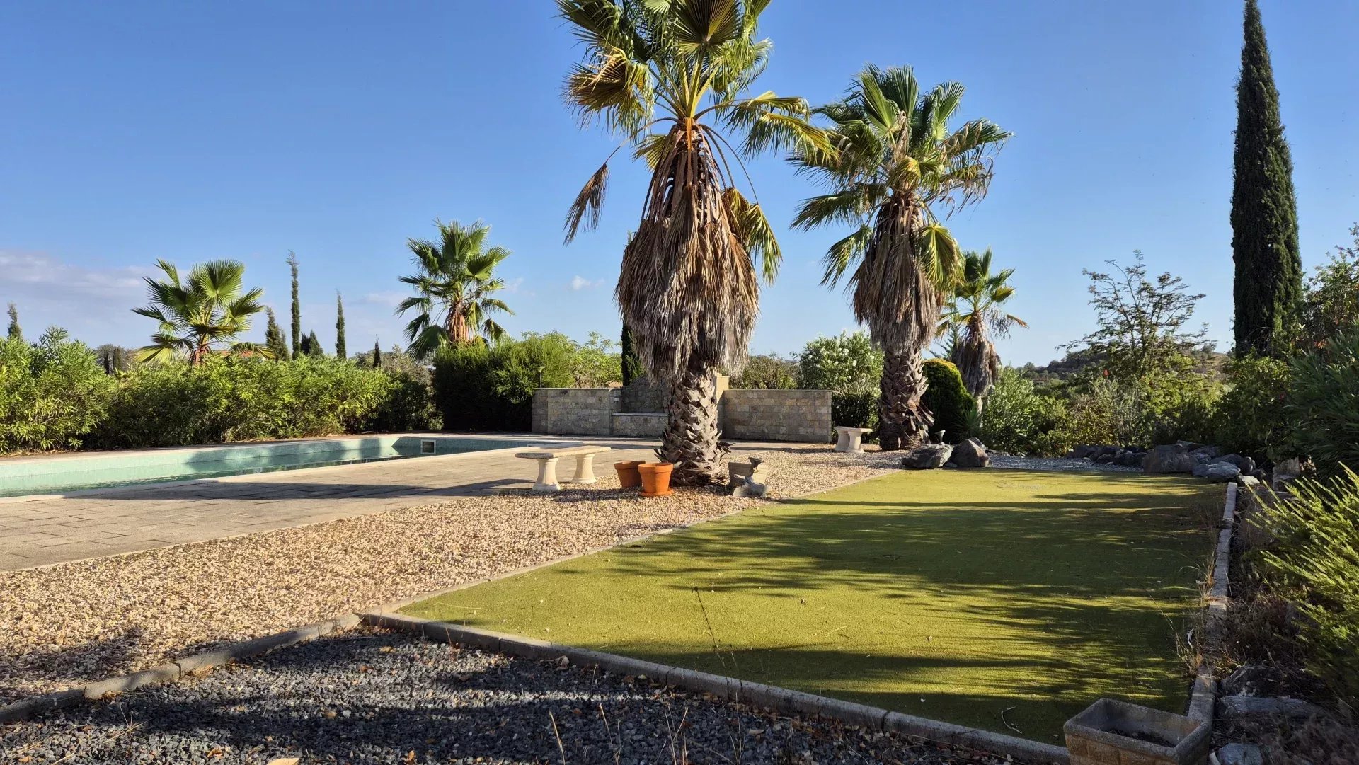 Spacious and Secure Outdoors: Over 5 hectares of private land that has a local farmer who can tend to the land should you need low maintenance care. There is a high quality 2 metre tall wild boar-proof fencing specially ordered from Germany. Count on multiple interior and exterior entertainment areas such as a roof terrace and patio, grand living room, covered outbuildings, storage rooms, and curated walkways throughout the garden area, perfect for walking your dogs. The stunning landscaped gardens surround a large private pool with access to the grand living room through 3 double french doors and the master bedroom.