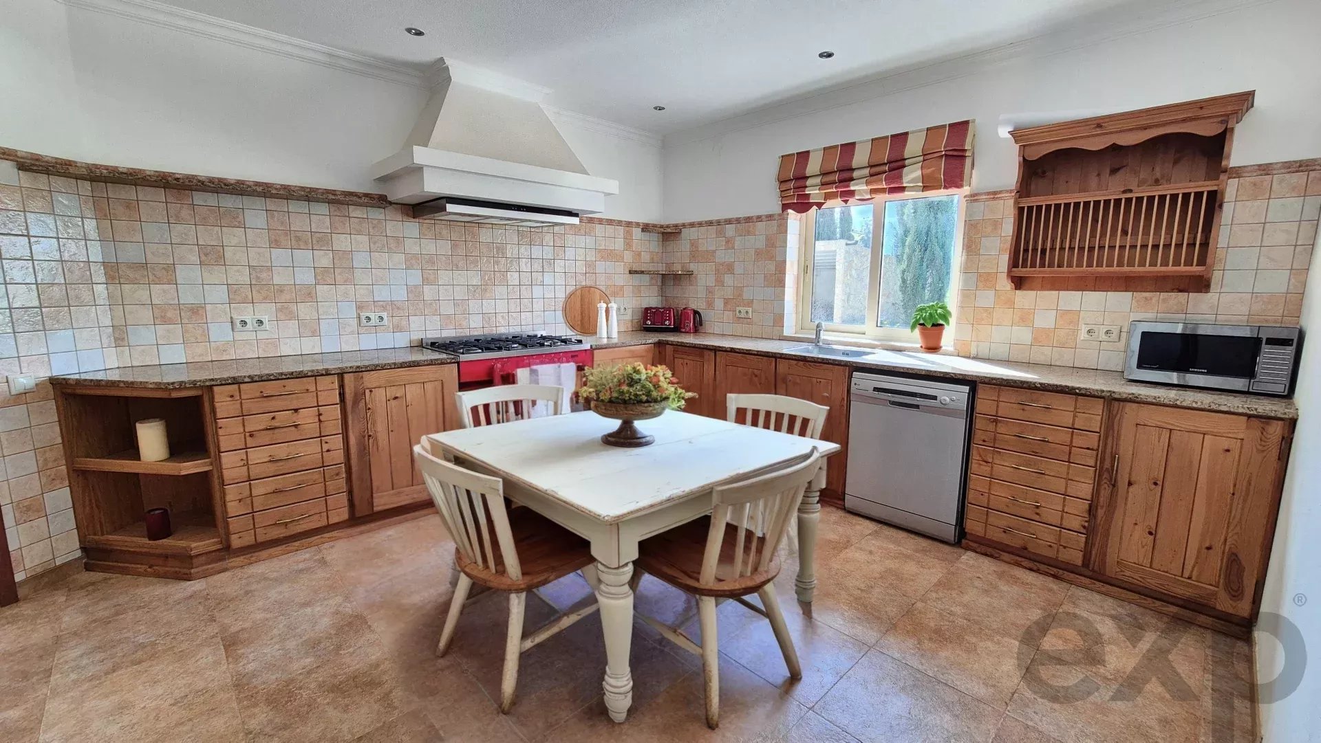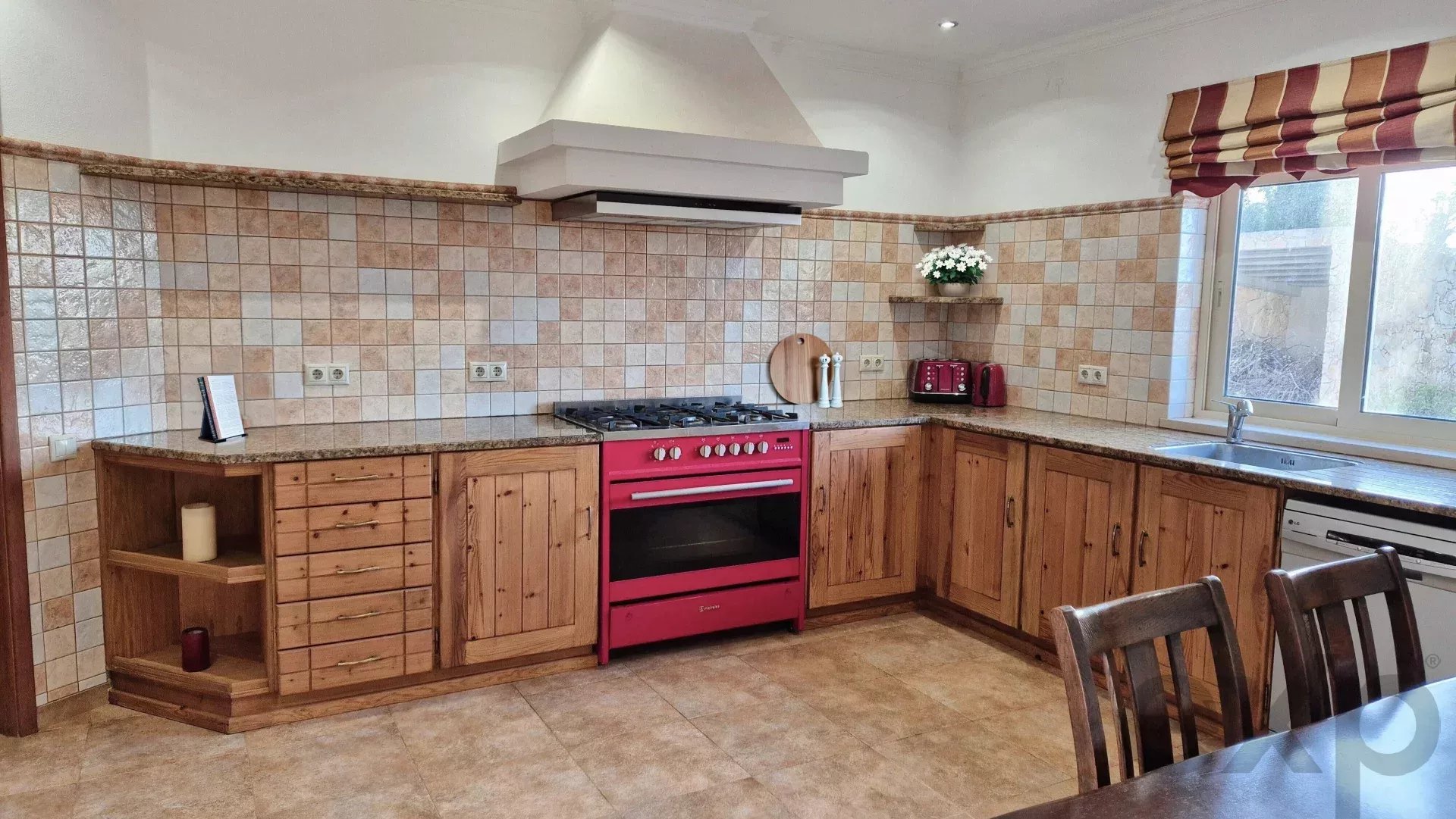 Modern Comforts: Featuring bespoke kitchen cabinetry with granite countertops, large gas cooker, and American-style fridge, along with an adjacent kitchenette and laundry room equipped with a washing machine and dryer, having access to the kitchen and outdoor service door. Most windows have tailor made mosquito nets.