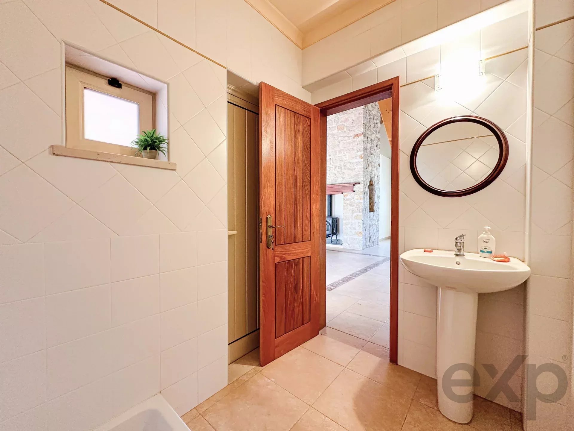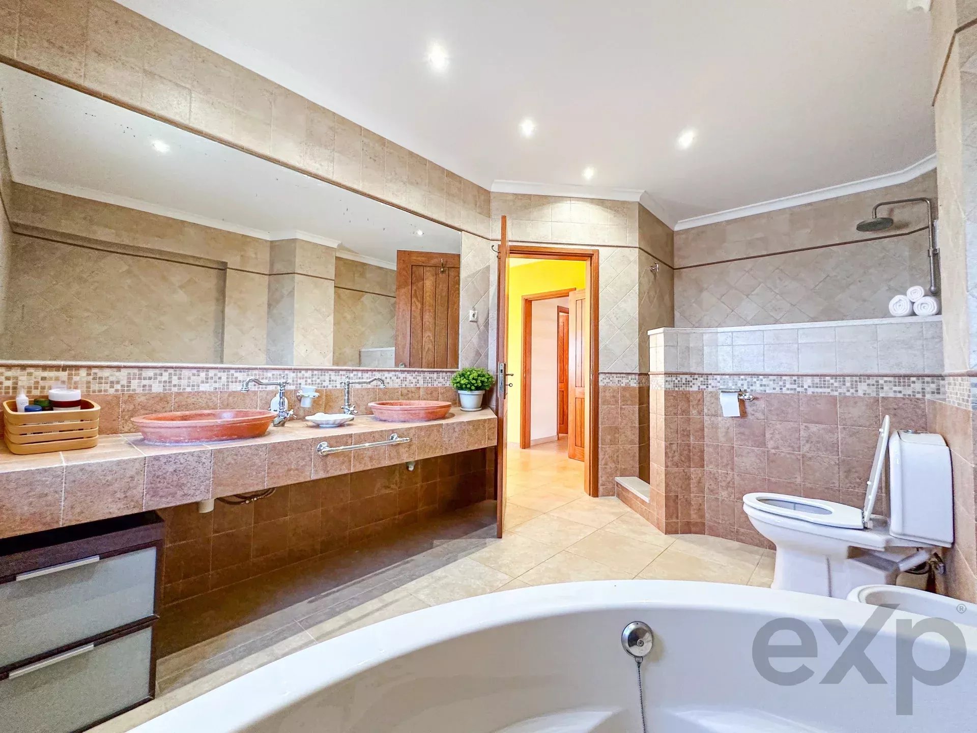 Living Areas: 4 large bedrooms where 1 is converted to a second smaller living room, 3 large bedrooms with en-suite full bathrooms and a social full bathroom with a shower that connects to the pool and living room side. The grand living room has made to measure Swedish pine vaulted ceiling beams to complement the character of the stone fireplace, and add extra insulation, which complement the tiled uniquely designed flooring.