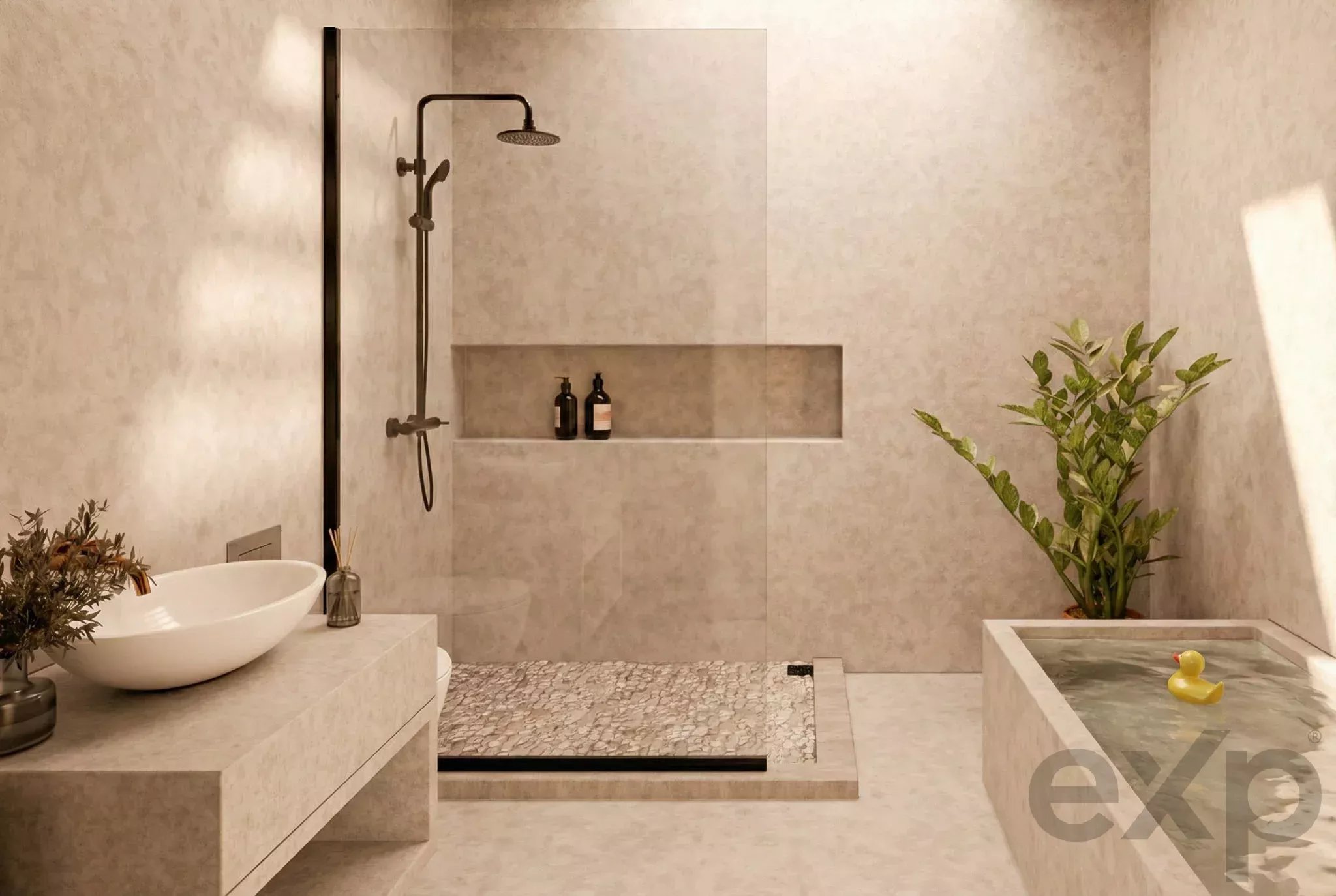With four bedrooms and three equipped bathrooms, family morning routines are serene. The bathrooms feature large ceramic tiles with a grounding, natural stone look. Meanwhile, the GEALAN double-glazed windows wrap your living spaces in silence, boasting roughly 50 dB of acoustic reduction to ensure total peace.