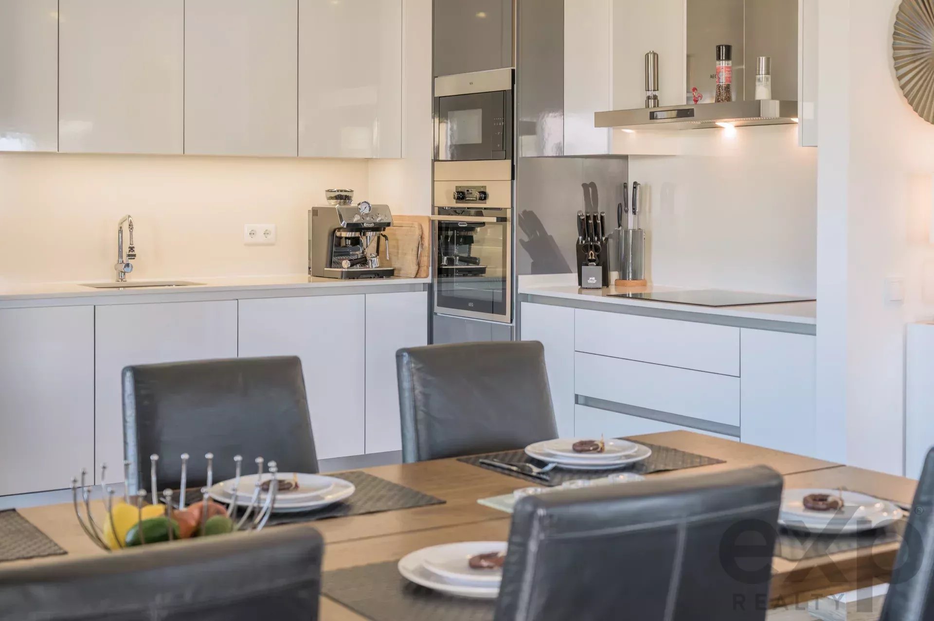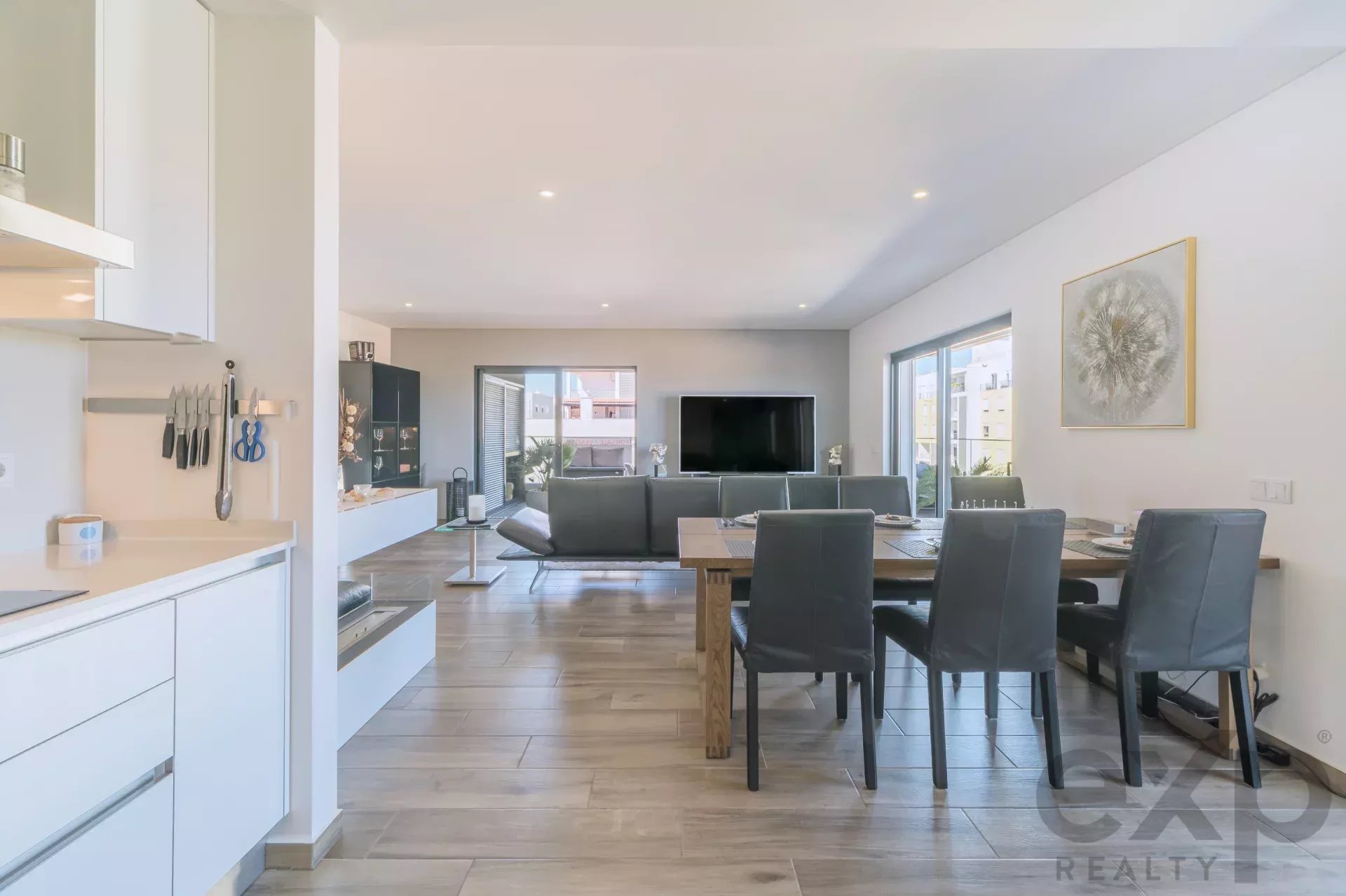 Upon entry, the living room welcomes you with floor-to-ceiling windows that frame breathtaking views. Directly ahead, the expansive terrace invites sunrise breakfasts, evening wine tasting, and weekend barbecues. To the right, the fully equipped kitchen features modern cabinetry and a second access point to the terrace, ensuring light and airflow throughout the day.